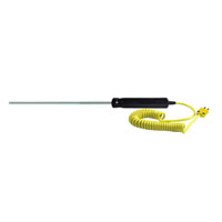 We offer a wide range of hand held thermocouple sensors for a variety of applications. All sensors are supplied with a 1 metre coiled lead when extended and a fixed miniature flat pin plug which makes them suitable for all our hand held instruments. They can of course be connected to other instrumentation such as temperature controllers by using thermocouple extension cable and the appropriate connectors which can also found in this catalogue. Our general purpose style is offered with a semi flexible mineral insulated sheath in either 2mm to 6mm diameter in lengths of 100mm to 500mm. The stem is rated to 800°C and the handle to 105°C.